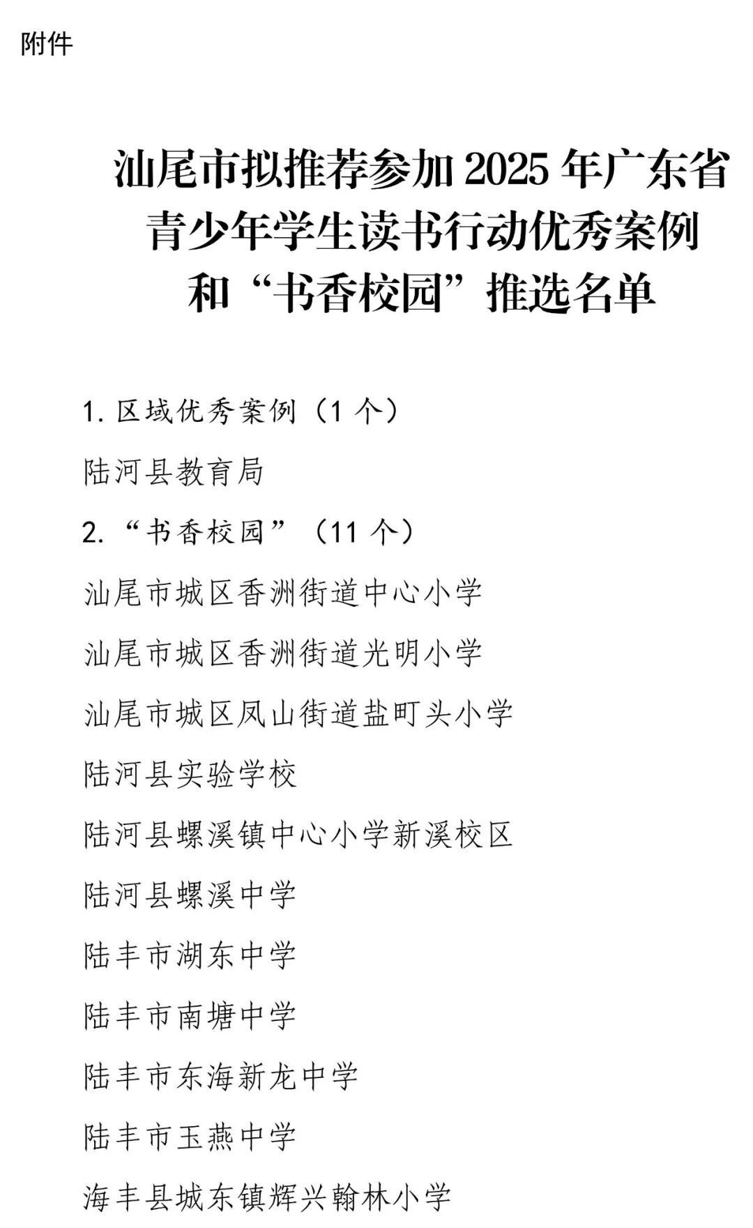 附件:汕尾市拟保举插足2025年广东省青少年学生念书步履优秀案例和“书香校园”推选名单